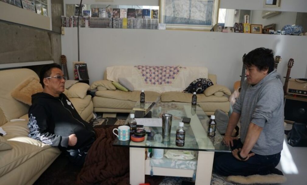 自宅リビングには、DVD(Vシネマ系)、ソファーの他に、ギターが複数本置かれています。