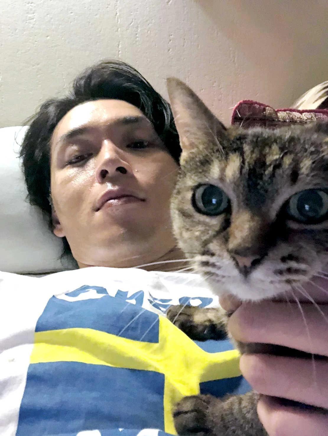 【写真】自宅で愛猫みかんちゃんとともに@2019年