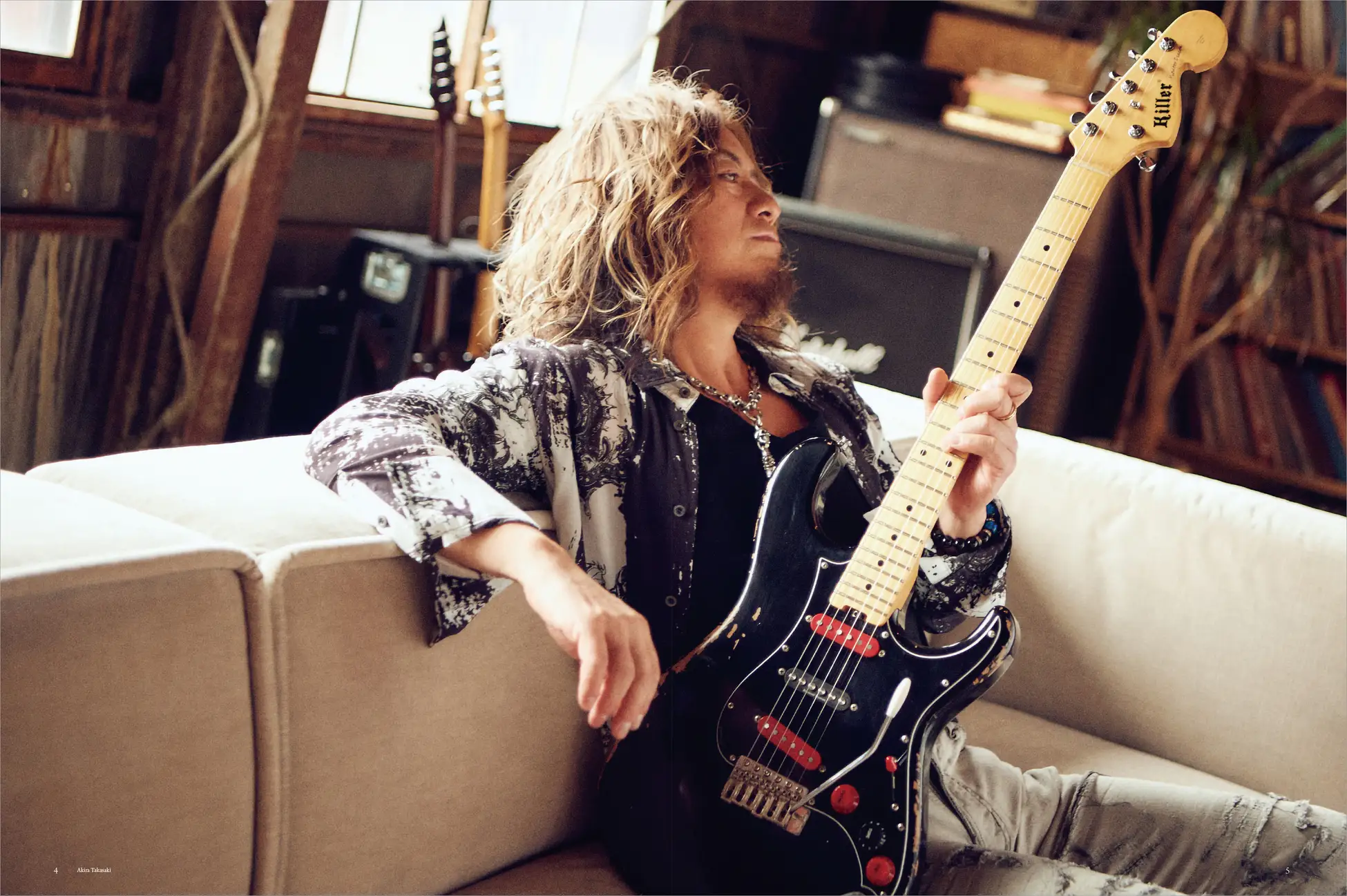 - 内部は非公開だが、ギター50本超の自宅スタジオ環境あり