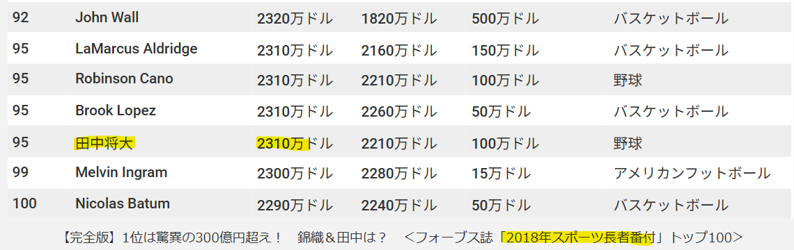 ![]() | 田中 将大 」 | 3位 👑 推定年収 9.0億円 (’20年度) |